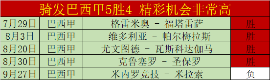 巴西甲5胜4,昨天巴西乙同样夺胜,巴西赛发挥值得重视。昨天5胜4,连胜2天,说明调整有效,骄傲的胜+表现再启动。