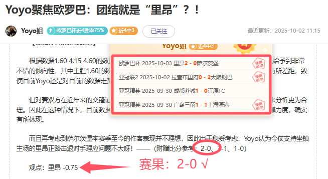 【上期回顾】:昨天私推暂停,不过近5胜4表现不俗!而公推亚冠和超级重点欧罗巴方案纷纷击出,后者近15胜11状态出色哟!——今天核心赛事已确认,信心依旧,各位可点击一下【赞赏】按钮给予鼓励,轻松在“站内信”获取当天新鲜信心专场哦!多一份参考离喜悦再近一步,Yoyo将继续率粉粉们继续前行~