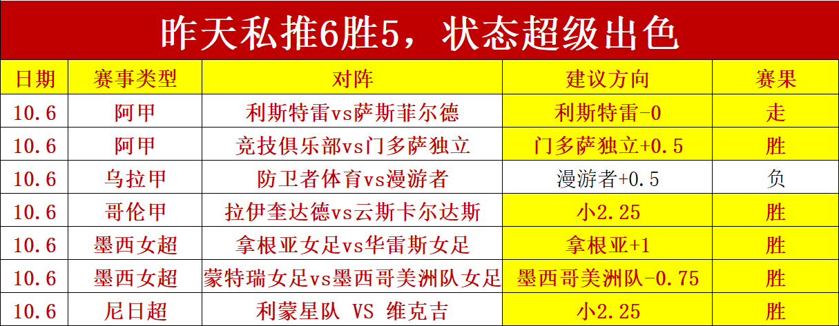 一、战绩回顾:昨天私推的表现十分出色,7场仅失1,拿下6胜5的佳绩,解锁贴5场失2表现平平,今天继续追击(温馨提醒:为了进一步提高精准度,经过团队深度研究,现在起发布的观点贴不会过早,会持续关注数据的变化才作出最终的判断,因为数据会随市场冷热度而做出调整,初始只能作为初步的参考,笔者会分为初始-中期-后期三个阶段进行全面的的分析)