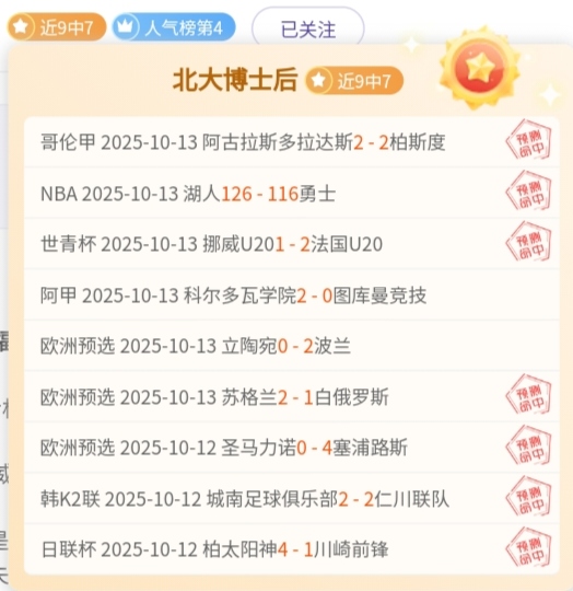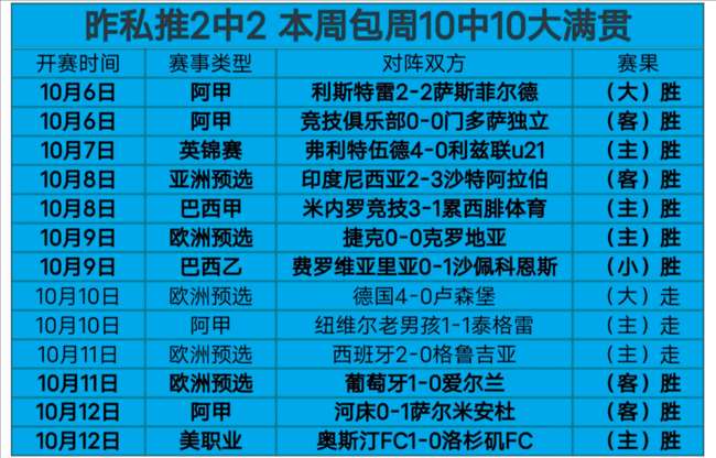 【战绩回顾】炸裂!!——昨晚私推阿甲+美职又双红,助力包周10中10全胜大满贯,连续三周实现英利(累计拿下28个胜场),祝贺三周跟全的老板!另外昨天文章9中7也是相当强势。上周完美收官,可喜可贺!新的一周,博士继续带领大家冲刺新的高度,各位老板——跟紧了!