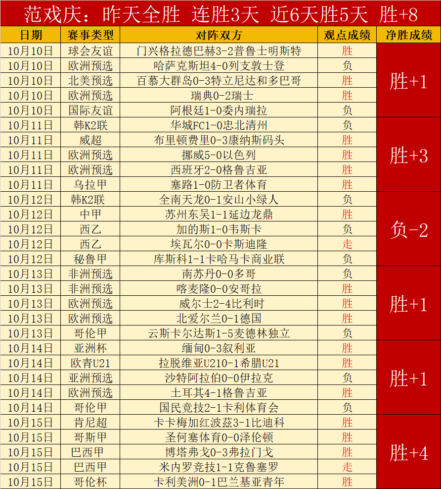 昨全胜,连胜3天,6天胜5天,合计胜+8。9月15日打出10连胜,17连胜记录也是在近期出现的,大胜是频繁出现的高超实力。