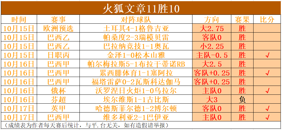 【小女子状态回顾】近期火狐状态依旧有保证,昨天送出的俄杯、英甲和巴西甲全都顺利打出,只是芬超预测出现偏差,目前还有一场哥斯甲正在进行当中,文章11胜10,并拿下5场比分!同时赞赏方面,昨送出的丹麦甲也顺利打出,包周近3零失!今天别忘了继续关注火狐的动态哦!