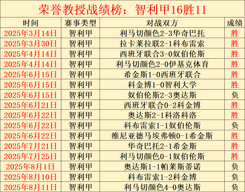 智利甲16胜11。最高打下14连胜的表现已见证实力。今天继续奉上强项赛事系列,各线赛事都能保证清晰的解读思路与靠谱的选择方向!截至昨天荣誉教授已经有4086场解读经验,今天继续精选5场,多元化的赛事系列,以更高连胜胜利率绩迎接5000场记录来临,关注荣誉教授,成为荣誉教授的好伙伴!