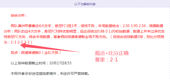 下午早场澳超赛事,阿德莱德联主场2-1力克悉尼FC,观点方向+比分完美打出。
