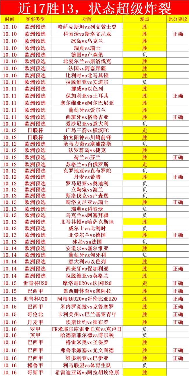 二、欧洲预选佳绩:连续6天的欧洲预选结束了,笔者创造了惊人的战绩,欧洲预选6天合计观点拿下39胜25的佳绩,命中11场比分。