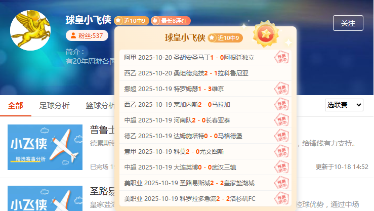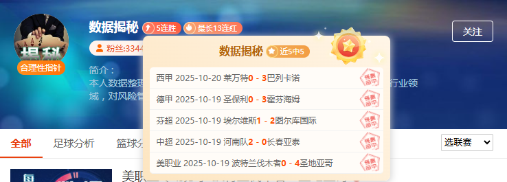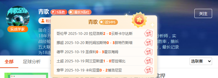 老牌分析师青歌”- 5连胜 经验派代表:擅长五大联赛与实战学案,近5场全中!18年实战经验积累,连红节奏持续中!青歌出手,稳操胜券!跟紧老牌分析师,赢在专业与经验!