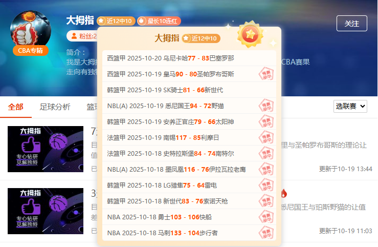 篮球专精大拇指”- 12中10状态火热 篮球赛场精准制导:西篮甲皇马VS圣帕罗布哥斯、韩篮甲安养正官庄VS太阳神、法篮甲南锡VS利摩日等全部拿捏!专心钻研顶级篮球,从韩篮甲到NBA无所不精!大拇指带你专攻篮球,收割连红!