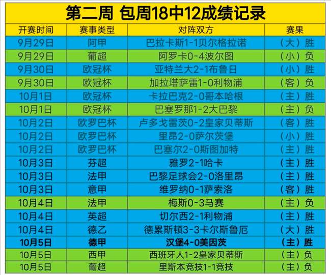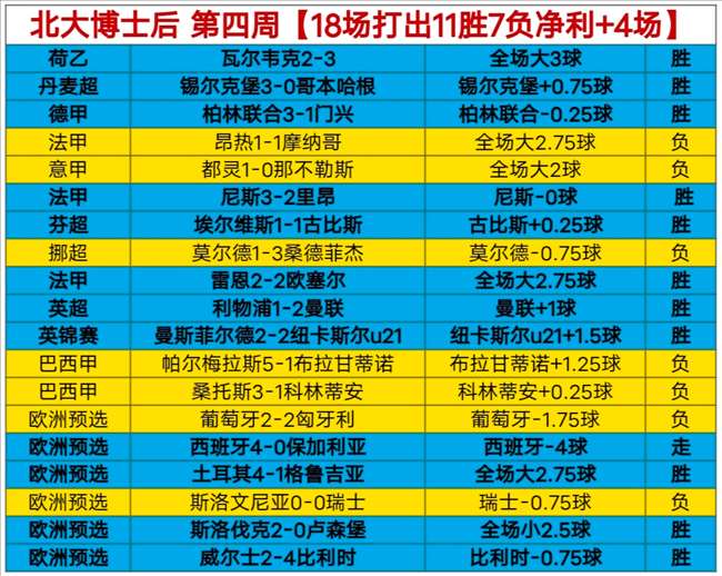 【上周总结】上周包周成绩依然强势,7天胜5天 负2天,总计18场打出11胜7负的佳绩,连续四周实现英利,累计拿下32个胜场,恭喜包周的老板,感谢一路的见证,新的一周,新的挑战,用心分享,欢迎新朋友加入!文末赞赏获取更精准的临场私推,包周更优惠哦!