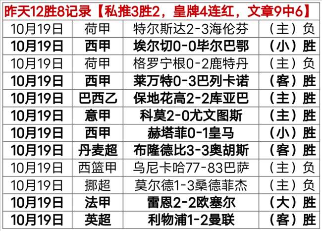 【战绩回顾】昨天文章+私推12胜8,其中五大联赛6场炸裂全胜,皇牌场次(巴西乙)拿下四连胜,私推3中2,上周完美收官!新的一周,再接再厉!