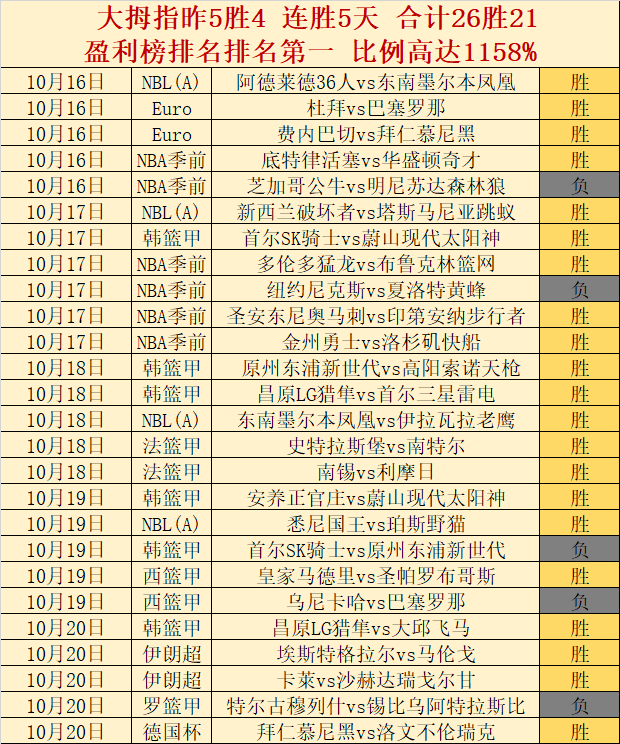 昨5胜4,大胜5天26胜21,营利榜第一(1158%),超级浮夸的精彩!