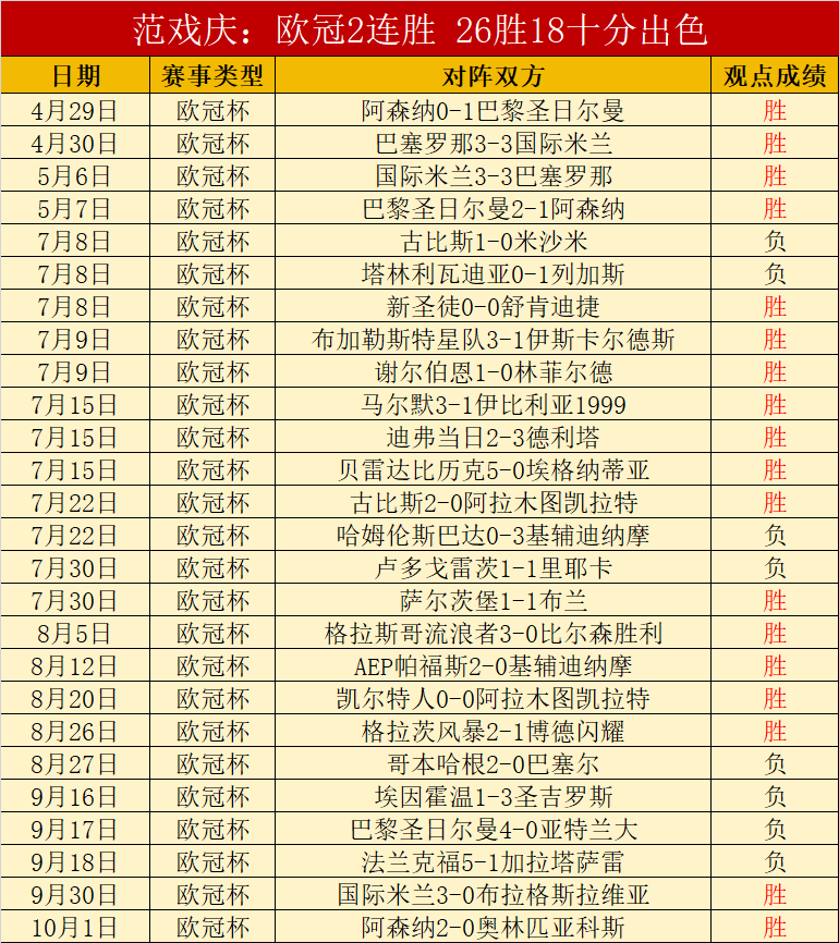 欧冠2连胜,26场胜18场,贡献胜+10,欧冠长时段保持精彩。昨5胜4,11天胜9天,合计胜+13,新一周延续胜利。9月15日打出10连胜,17连胜记录也是在近期出现的,大胜是频繁出现的高超实力。