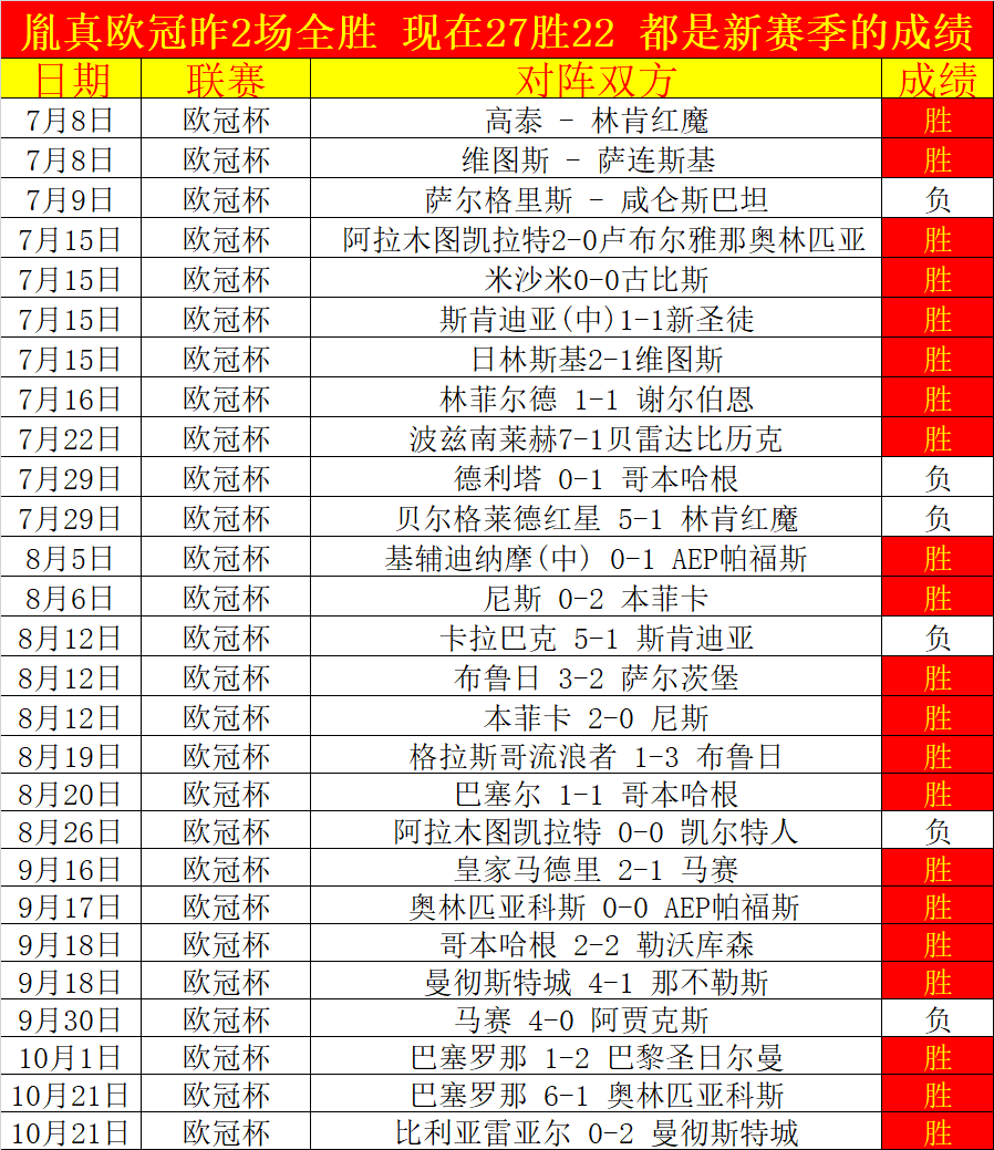欧冠昨2场全胜,新赛季取得27胜22精彩表现,欧冠思维特别清晰。昨继续保持胜利,目前近15胜12,14天胜9天胜+13,胜+增长速度很精彩!