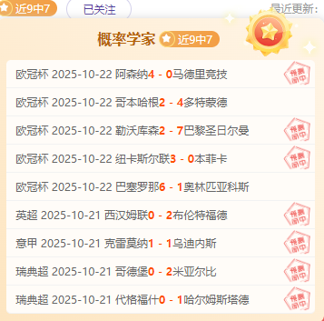 最近更新:2025-10-22 15:17 欧冠杯近8胜率75%近9中7