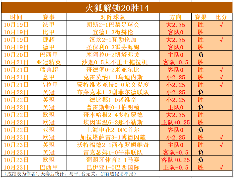 【小女子状态回顾】近期火狐状态依旧有保证,昨天送出的欧冠、英冠和巴西甲全部顺利打出,只是亚冠和另外一场英冠及欧冠预测结果出现偏差,解锁20胜14,并连中8场比分!同时赞赏方面,昨送出的俄杯也顺利打出!今天别忘了继续关注火狐的动态哦!