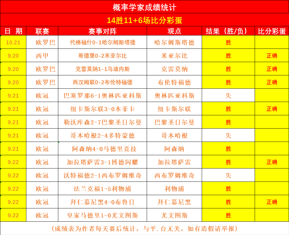 战绩回顾:14胜11+6场比分彩蛋,连续多天取得正向成绩,状态相当理想。大家可以点点关注,建议不要单单挑选某一场比赛,某一篇文章,要留意概率送出的每一场比赛,这样就可以更好地与概率同步,可以长期取得正向的收获。