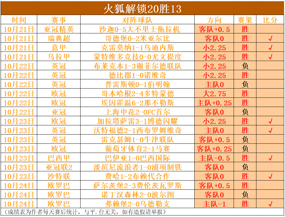 【小女子状态回顾】近期火狐状态依旧有保证,昨天解锁送出的2场欧罗巴及沙特联全部顺利打出,只是亚冠联2和另外一场欧罗巴预测结果出现偏差,解锁20胜13,并连中8场比分!今天别忘了继续关注火狐的动态哦!