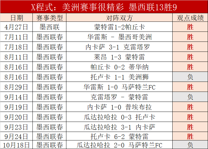 墨西联13胜9,美洲赛事经验丰富保持精彩。5天胜4天,5天合计胜+4,近22胜13,又开启过往的精彩模式了!