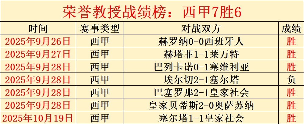 西甲7胜6,最高打下14连胜的表现已见证实力。今天继续奉上强项赛事系列,各线赛事都能保证清晰的解读思路与靠谱的选择方向!截至昨天荣誉教授已经有4126场解读经验,今天继续精选5场,多元化的赛事系列,以更高连胜胜利率绩迎接5000场记录来临,关注荣誉教授,成为荣誉教授的好伙伴!