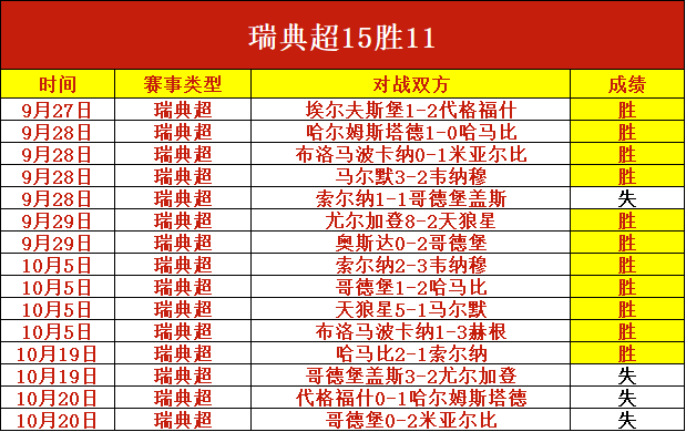 瑞典超15胜11!今天赛事依旧选择强项系列,持续稳,别错过了!笔者近期前进脚步表现仍然优秀,本日赛程继续出击,争取在稳健的基础上进一步突破!