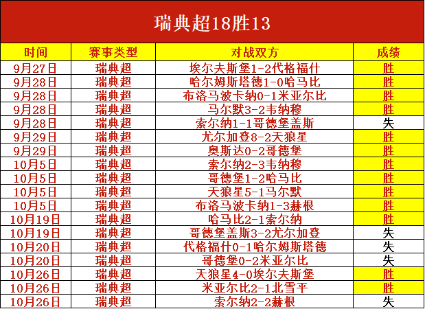 瑞典超18胜13!今天赛事依旧选择强项系列,持续稳,别错过了!笔者近期前进脚步表现仍然优秀,本日赛程继续出击,争取在稳健的基础上进一步突破!