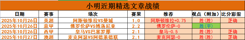 【上期回顾】昨整体10中6,文章8中4,皇马、维拉、莱万特全出,意甲平。赞赏2场全胜,水晶宫+尼斯全出,赞赏近9胜7!昨新推出的《王牌赛事》2场全对,上周文章净增14场,赞赏净增5场,发挥超神!本周继续努力。