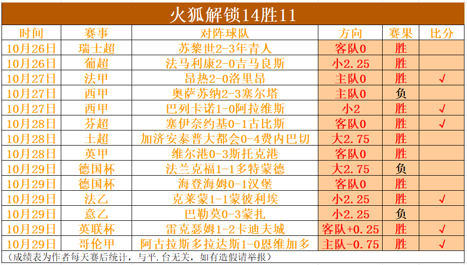 【小女子状态回顾】近期火狐状态依旧有保证,昨天解锁送出的德国杯、法乙、英联杯和哥伦甲全都顺利打出,只是另外一场德国杯和意乙预测出现偏差,解锁近14胜11!今天别忘了继续关注火狐的动态哦!