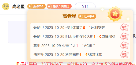 擅长联赛:中日韩澳+五大联赛,焦点表现:巅峰战绩月内30战胜23,分析风格:从基本面探底结合内部数据变化追踪,权衡主客战绩分配偏重要点。