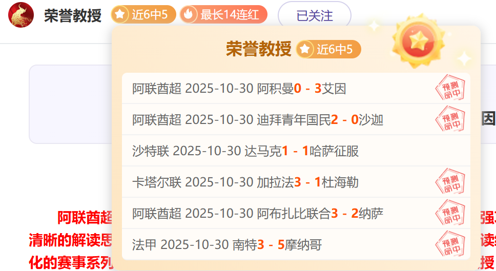 昨天一波暴胜,拿下5胜4,小联赛一直是荣誉教授的拿手绝活,最高打下14连胜的表现已见证实力。今天继续奉上强项赛事系列,各线赛事都能保证清晰的解读思路与靠谱的选择方向!截至昨天荣誉教授已经有4161场解读经验,今天继续精选5场,多元化的赛事系列,以更高连胜胜利率绩迎接5000场记录来临,关注荣誉教授,成为荣誉教授的好伙伴!