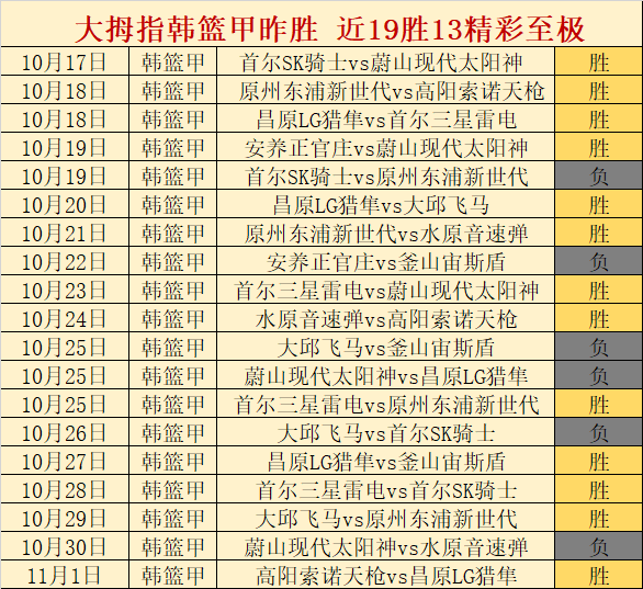 韩篮甲昨天胜利,现在19胜13,一直的取胜的主力。近4连胜,近8胜7,很明显精彩状态归来!