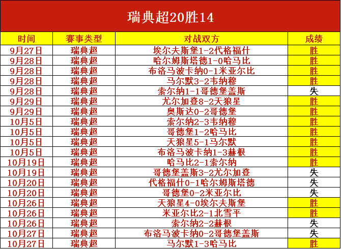 瑞典超20胜14!今天赛事依旧选择强项系列,持续稳,别错过了!笔者近期前进脚步表现仍然优秀,本日赛程继续出击,争取在稳健的基础上进一步突破!