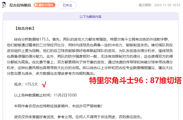 解锁内容包括:综合分析+比赛建议(数据观点+附加观点)