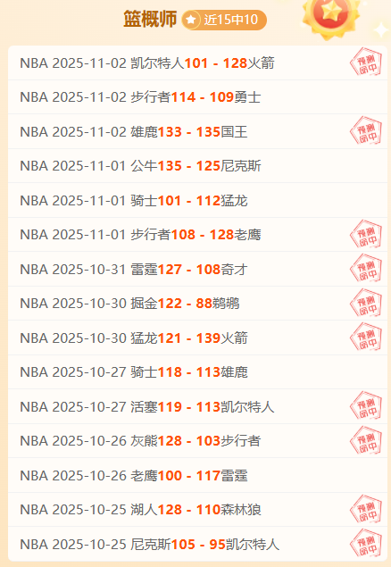 一、战绩回顾:NBA常规赛成绩是15中10,今天继续NBA,有需要的朋友请查收。