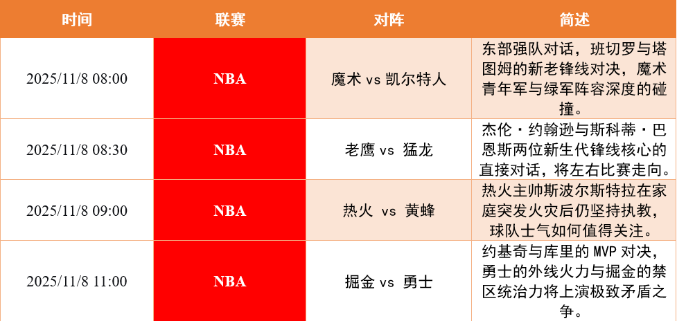 核心看点:凯尔特人核心杰森·塔图姆因跟腱伤势确认缺阵,攻防重担将更多地落在杰伦·布朗肩上。魔术方面,内线重要轮换莫里茨·瓦格纳也因膝伤缺席。此消彼长,魔术内线核心保罗 ·班凯罗的表现至关重要,他近期状态火热,上一场刚砍下22分11篮板8助攻。