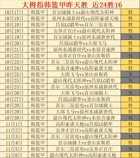 韩篮甲昨天胜利,现在近24胜16,思维保持清晰。近7天40场分析26胜14负 胜+12,当前状态值得肯定的!
