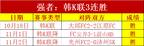 韩K联3连胜,早场亚赛一直发挥精彩。11月保持正向胜+,十月月成绩胜+16,月成绩保持强势