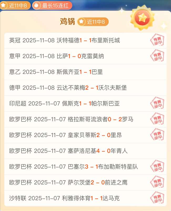 战绩回顾:昨日【每日超级重点】意甲比萨方向完美全胜,【每日超级重点】近16胜13,成绩很出色!解锁文章6战拿到2胜2走2负,成绩还行!意甲比萨、英冠布里斯托城完美全胜,比甲登德、西甲埃尔切走了,意乙斯佩齐亚、德甲狼堡没有打出!总进球数1场,丹麦甲科灵小方向没有打出,总进球数6胜4!赞赏数据昨晚没有发送!鸡锅不追求场次多,追求少而精准,绝不滥竽充数,必须把老铁们的每一份信任都转化为胜利!