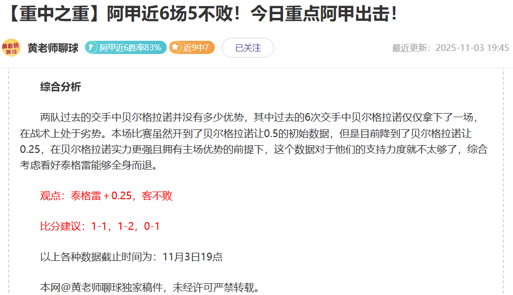 最近更新:2025-11-10 00:01 阿甲近6胜率83%近10中7