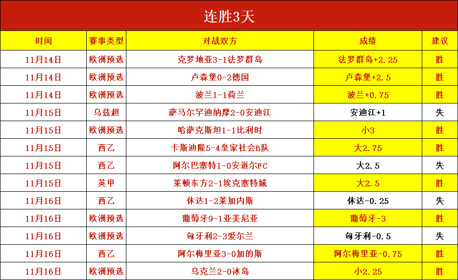 连胜3天!保持优秀战绩!今天赛事依旧选择强项系列,持续稳,别错过了!笔者近期前进脚步表现仍然优秀,本日赛程继续出击,争取在稳健的基础上进一步突破!