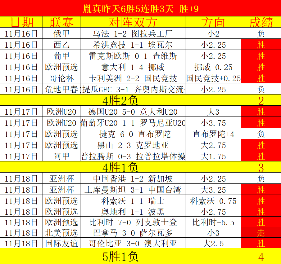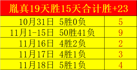 昨天6胜5,前天5胜4,连胜3天合计17胜13,19天胜15天胜+23,傲视群雄的胜+表现