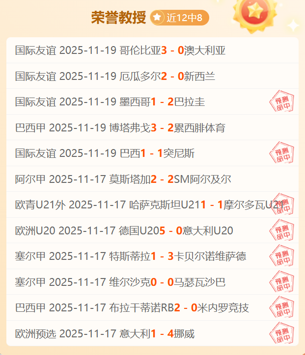 12胜8!6天胜+6,稳定的正向成绩。最高打下14连胜的表现已见证实力。今天继续奉上强项赛事系列,各线赛事都能保证清晰的解读思路与靠谱的选择方向!截至昨天荣誉教授已经有4250场解读经验,今天继续精选5场,多元化的赛事系列,以更高连胜胜利率绩迎接5000场记录来临,关注荣誉教授,成为荣誉教授的好伙伴!
