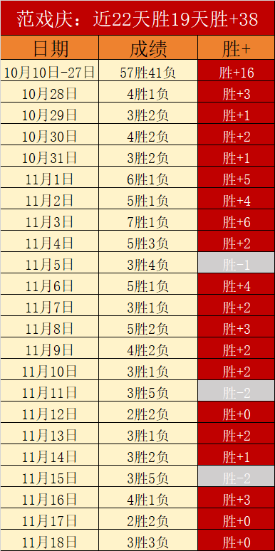 昨天平稳状态,22天胜19胜+38,这样的胜+表现肯定是独占鳌头的,10月10日-27日18天胜15天胜+16,胜+表现尤其突出