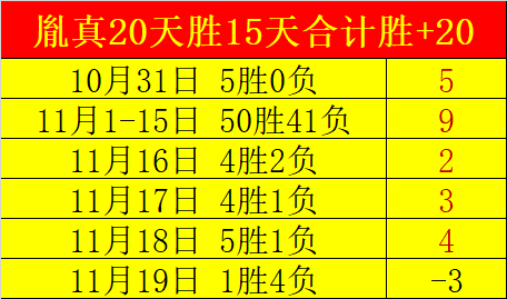 近4天胜3天,合计胜+6,20天胜15天胜+20,傲视群雄的胜+表现