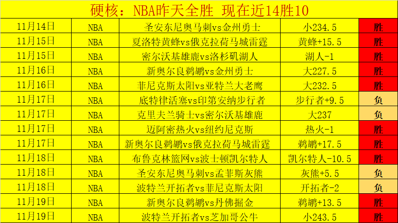 NBA昨天全胜发挥,现在NBA近14胜10,表现非常出色。近44场胜25场,胜+6,胜+效果非常优质!