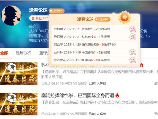 【本人介绍】逢春论球本名朱逢春,从2013年正式入职足球分析师,早年在澳门娱乐COM担任足球解说员-对亚欧数据变化的套路了如指掌。2018年俄罗斯世界杯更是2次拿下任14(一奖),2023年欧洲杯拿下23连红傲人的战绩。抓冷门技术更是一把好手,最近两年更是凭借一手独家的四维彩超数据分析将胜率再拔新高。逢春自2025年初有幸加入捷报网以来本着细心分析、诚心创作,内容全面的原则,为大家带来更精彩的足球。
