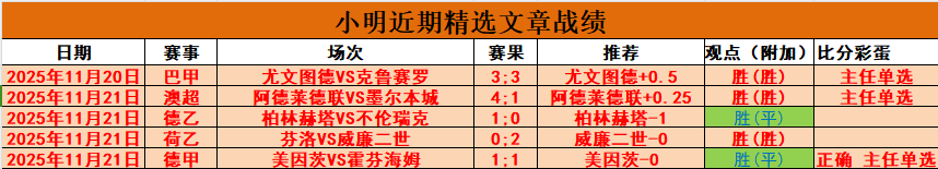 【上期回顾】拿下全胜,状态超神!昨整体5对5,文章4对4,数据2胜2平,澳超、荷乙打出,德甲、德乙打平。文章5场不败;赞赏1胜1,法甲大格局拿下,赞赏近5胜4。昨赞赏+文章再全对,好状态无需多言,今继续冲!