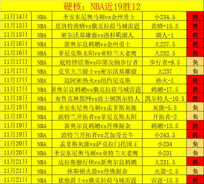 NBA近19胜12,表现非常出色。昨天胜利发挥,近54场胜31场,胜+8,胜+效果非常优质!