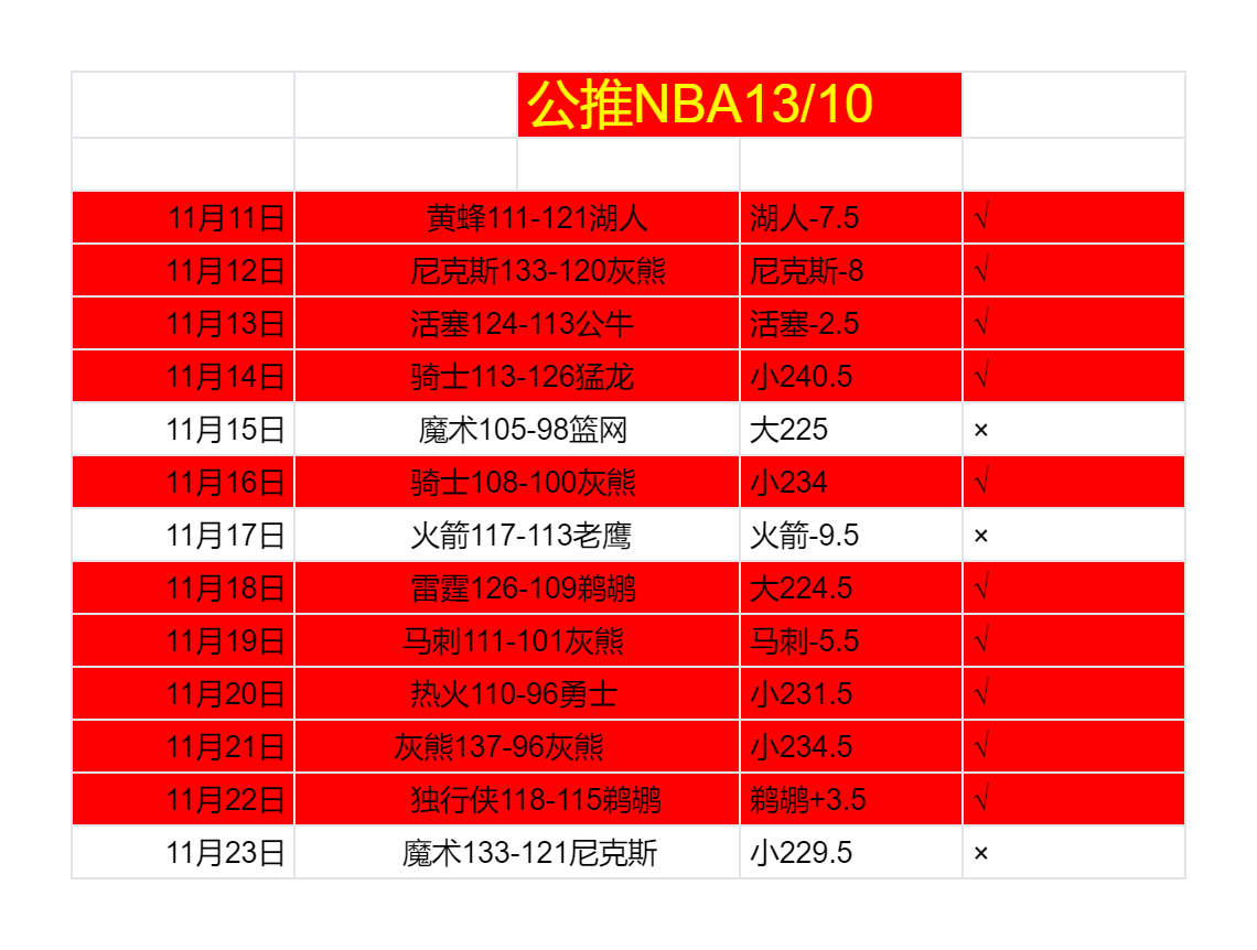 稳定NBA,每天一公推继续拿下近13中10公推连胜断了可惜了,今天3中2依然保持净胜,走的长期稳定路线 。