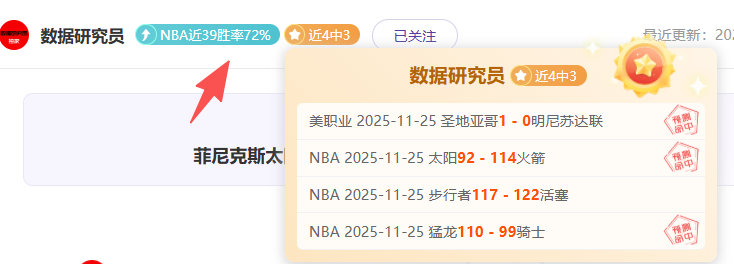 近4中3,早上的两场NBA咋们继续收,NBA作为我们的强项,近39中28,命中率已经来到了72%,话不多说上今日菜系!