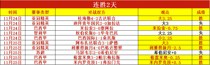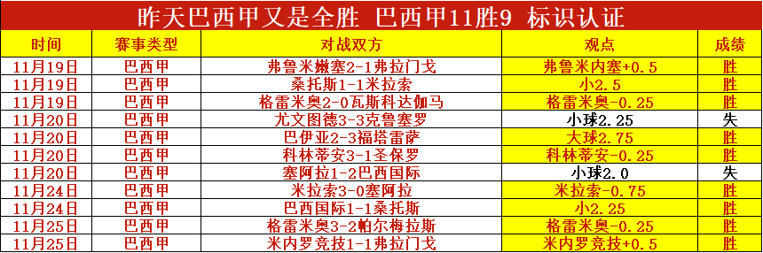 昨天5胜4,连胜2天,巴西甲昨天2场又是全胜,巴西甲目前11胜9,近期保持巴西赛事专业的经验,官方标识认证。