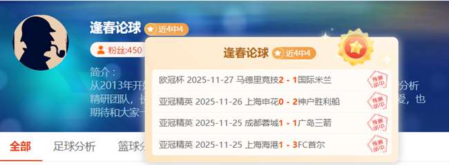 逢春论球本名朱逢春,早年担任足球解说员,从2013年正式入职足球分析师-对亚欧数据的变化套路了如指掌。2018年俄罗斯世界杯更是2次拿下任14(一奖),2023年欧洲杯拿下23连红的傲人战绩。抓冷门技术更是一把好手,最近两年更是凭借一手独家的四维彩超数据分析将胜率再拔新高。